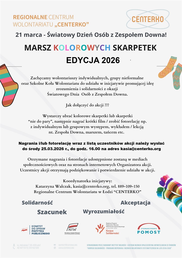 Zapraszamy do udziału w wyjątkowej inicjatywie społecznej „Marsz Kolorowych Skarpetek – Edycja 2026”, organizowanej przez Regionalne Centrum Wolontariatu w Łodzi z okazji Światowego Dnia Osób z Zespołem Downa.